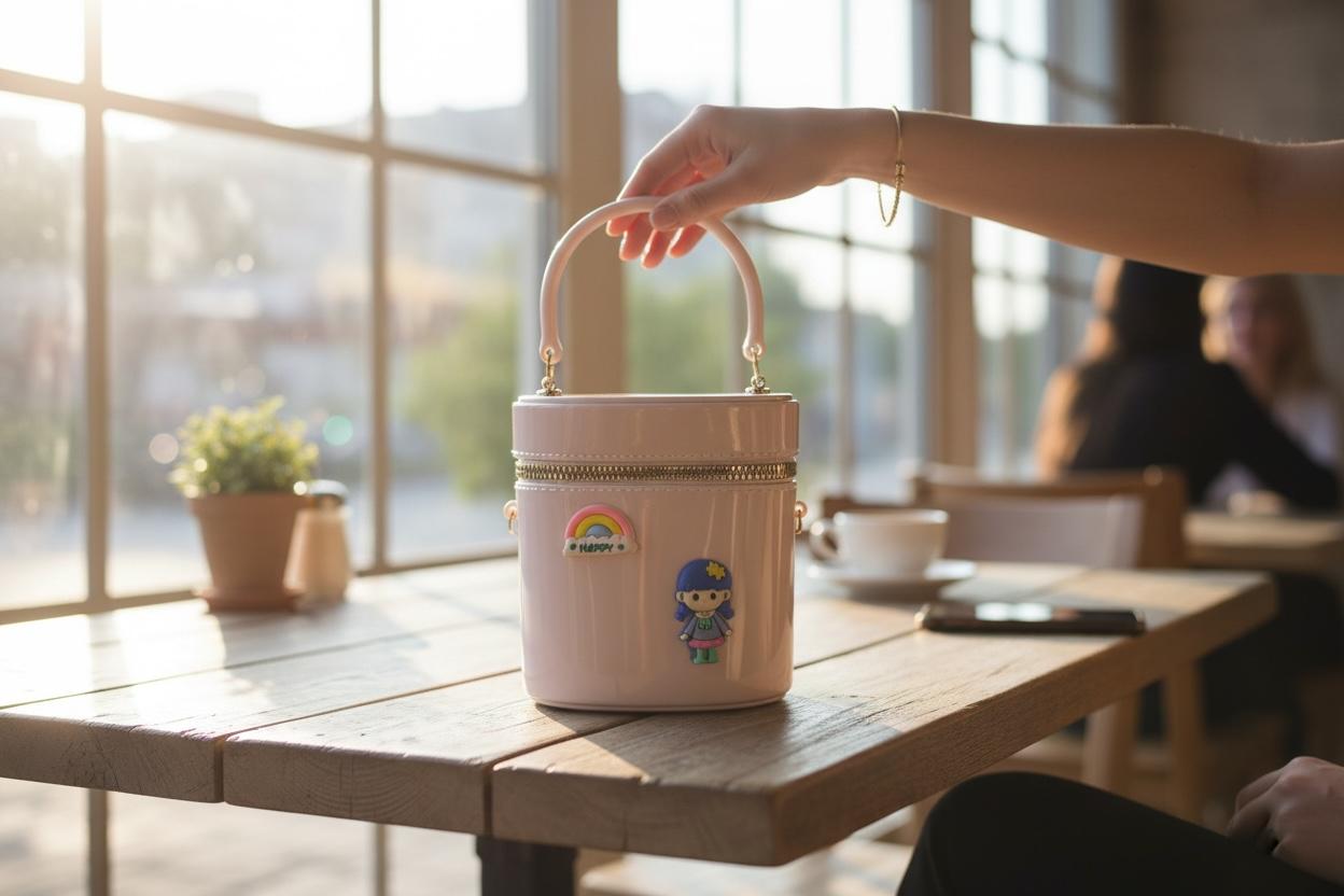 This adorable cylinder-shaped handbag is designed to steal hearts! Featuring a glossy pastel pink finish with cute cartoon charms and a stylish top handle, this bag is perfect for little girls who love fun yet fashionable accessories.