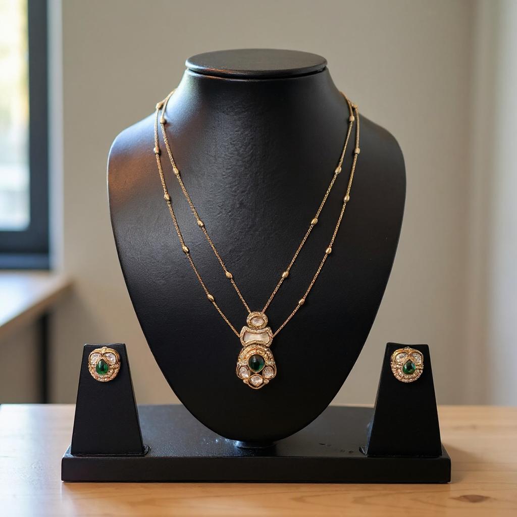 Emerald Green Dual Layer Pendant Set with Kundan Detailing