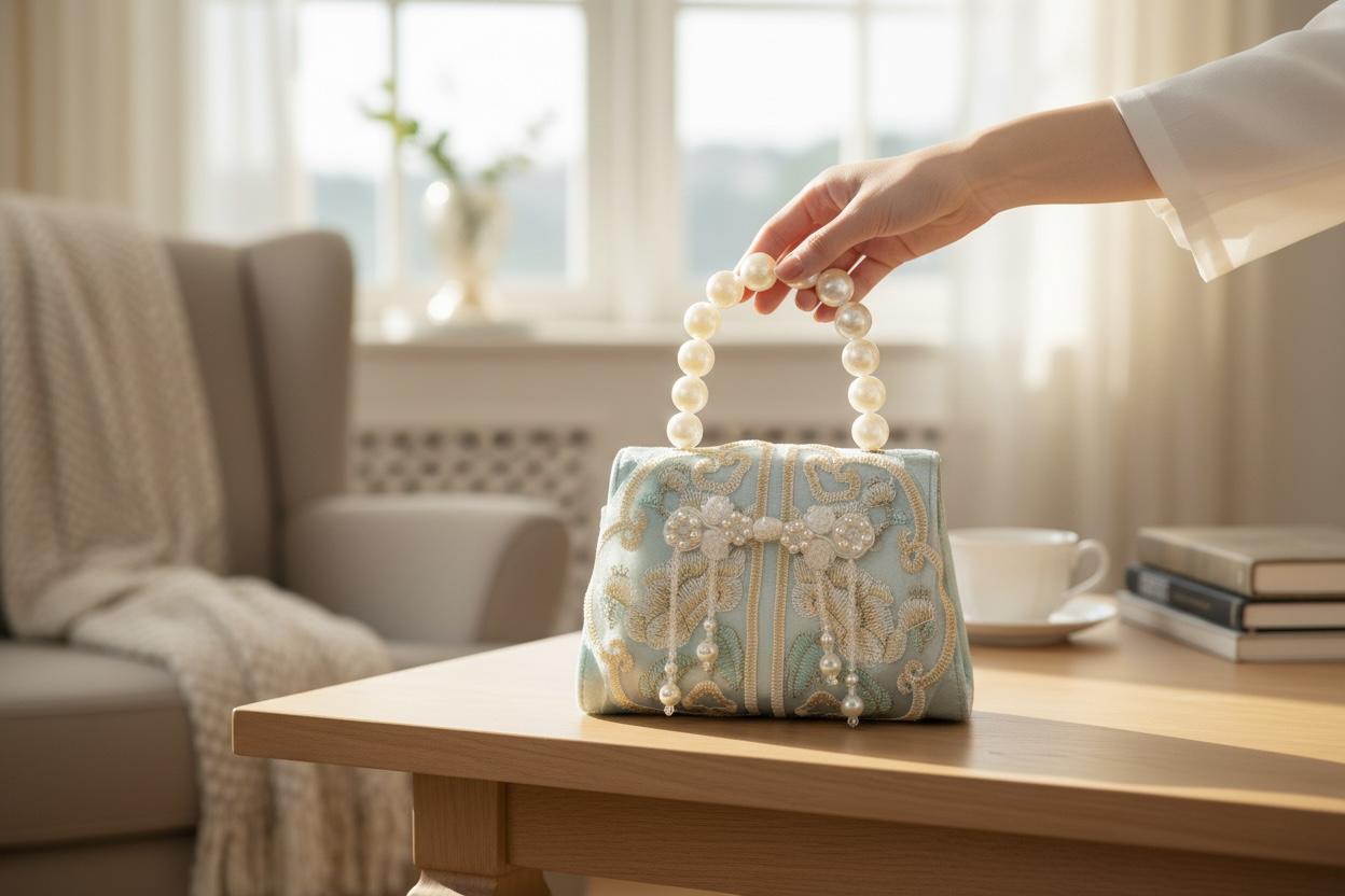 Pearl Handle Mint Embroidered Party Handbag for Girls